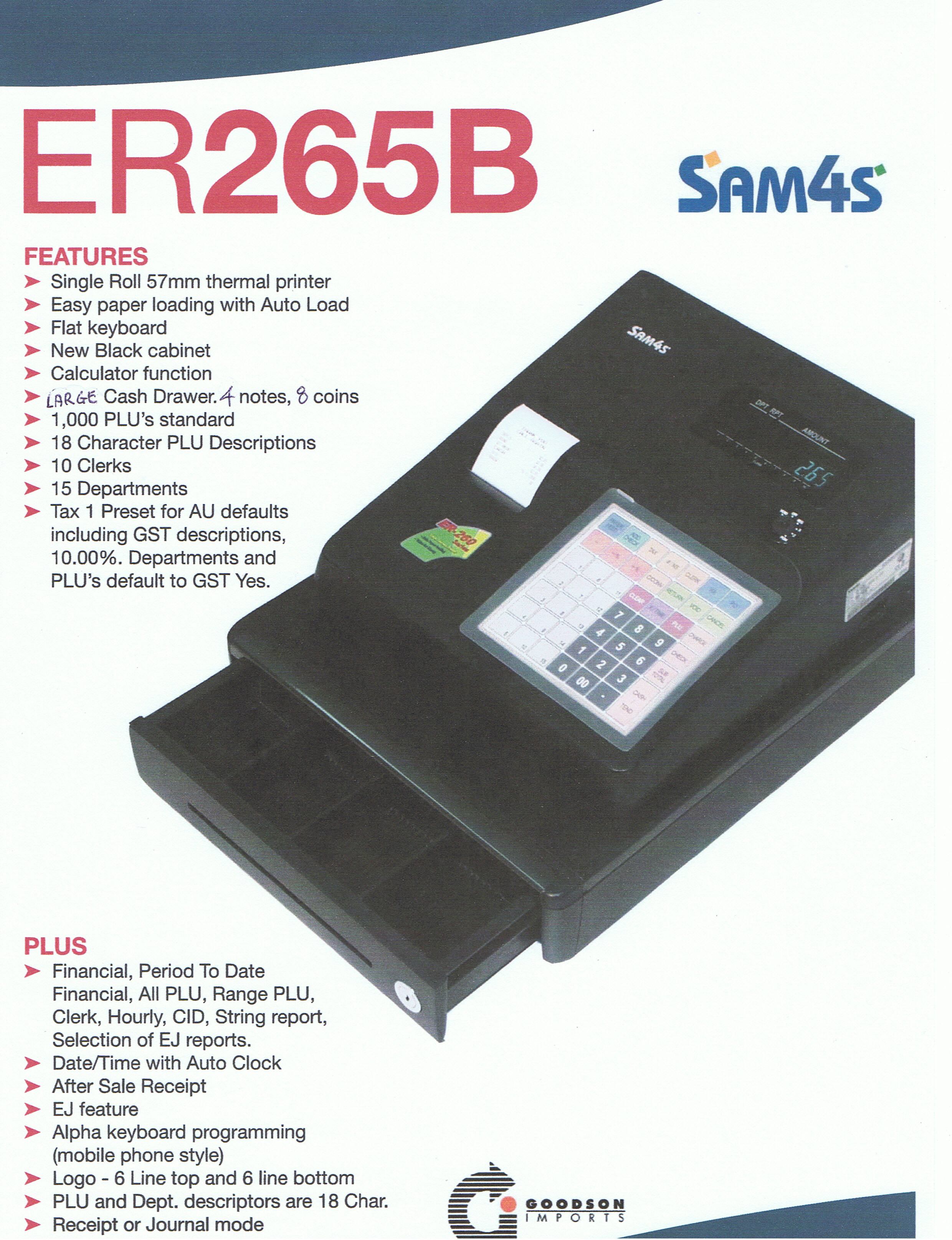 16 departments, thermal 57mm printer, logo, departments, PLU, clerks all print in words and numbers. Small drawer 4 notes/4 coins. A real beauty. Refer specs on www.goodson.com.au